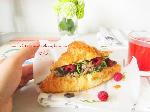 水浸吞拿鱼、芝麻菜、黑橄榄、覆盆子。拌了一点千岛酱和接骨木花浓缩汁。好吃!分给两个同学,她们眨着星星眼葱白我哟~#Dor...