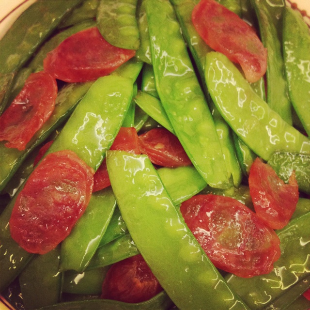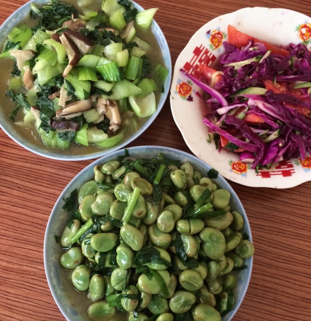 韭菜炒蚕豆,青菜炒肉,紫甘蓝拌青瓜
