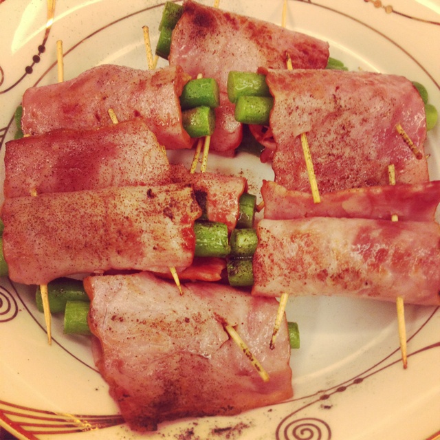 第一次做,芦笋切短了,培根也包不紧,不过真心好吃