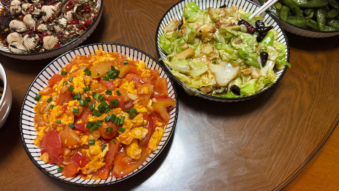 西红柿炒鸡蛋和干锅包菜