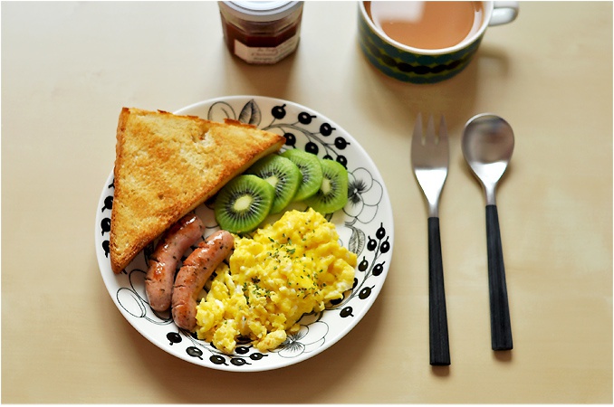 工作日快手早餐:紫苏小香肠,芝士炒蛋,烤土司,阿萨姆奶茶,猕猴桃.