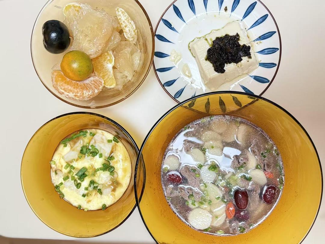 山药牛肉汤、鸡蛋羹蒸鳕鱼、橄榄菜豆腐