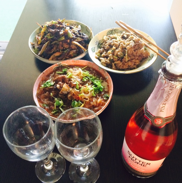 小炒茄子、牛肉粉、干煸牛肉配葡萄汽酒~