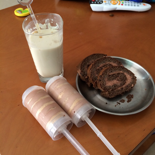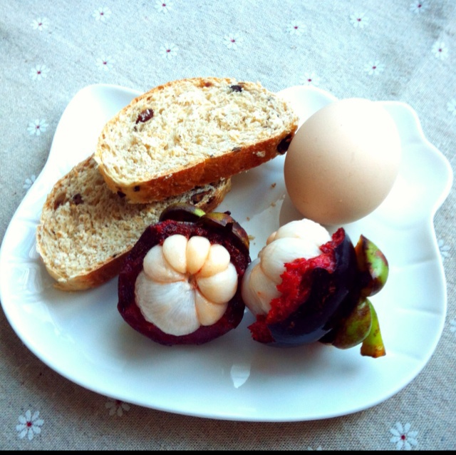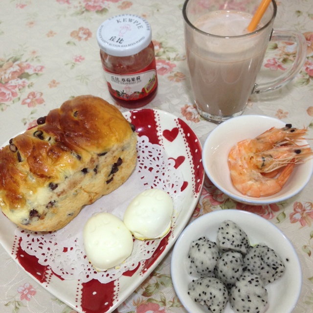 可可奶,自制红豆面包,小兔型煮蛋,火龙果