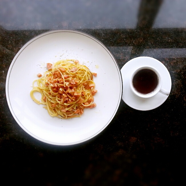 蒜香火腿意面配黑咖啡~