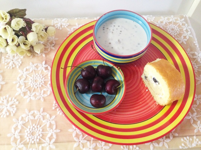 蓝莓蛋糕卷+香芋牛奶西米露+樱桃