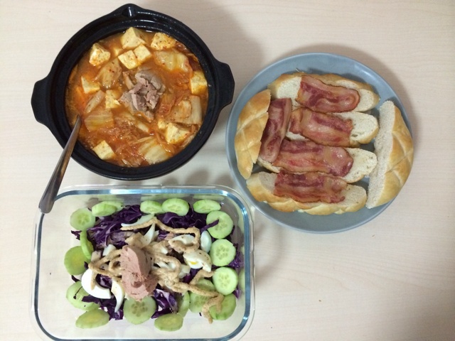 面包切片配培根+金枪鱼蔬菜沙拉+金枪鱼泡菜汤=无肉不欢滴营养早餐