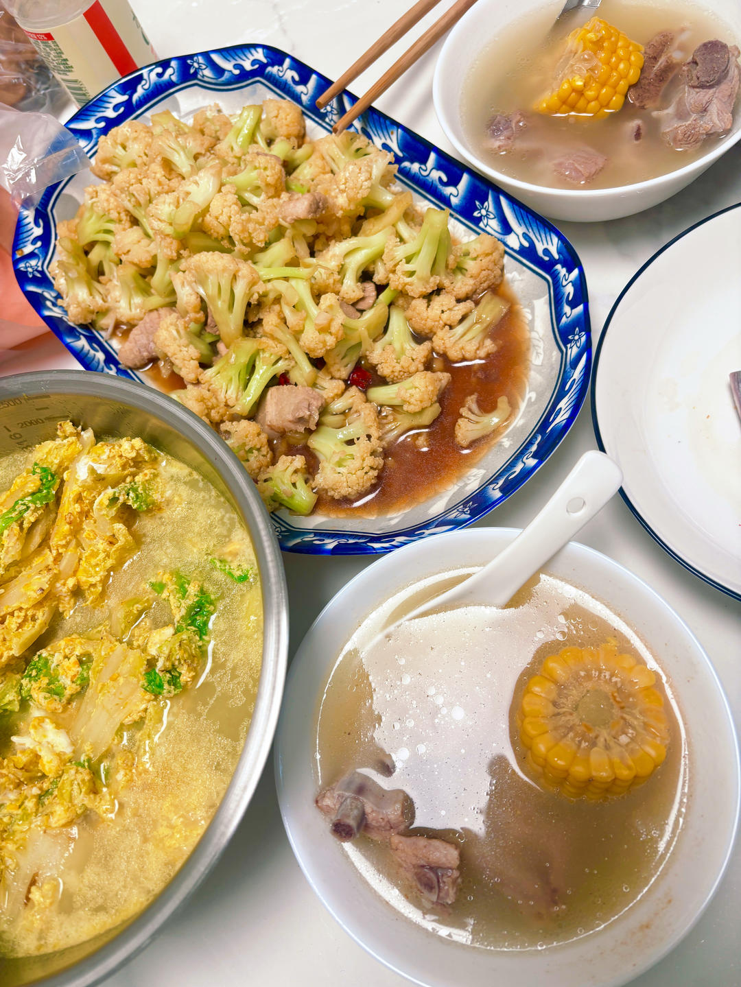 干锅菜花+茼蒿炒鸡蛋+尖椒炒素鸡