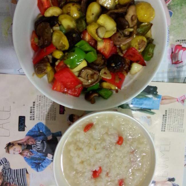 晚餐有点晚。香菇爆炒栗子