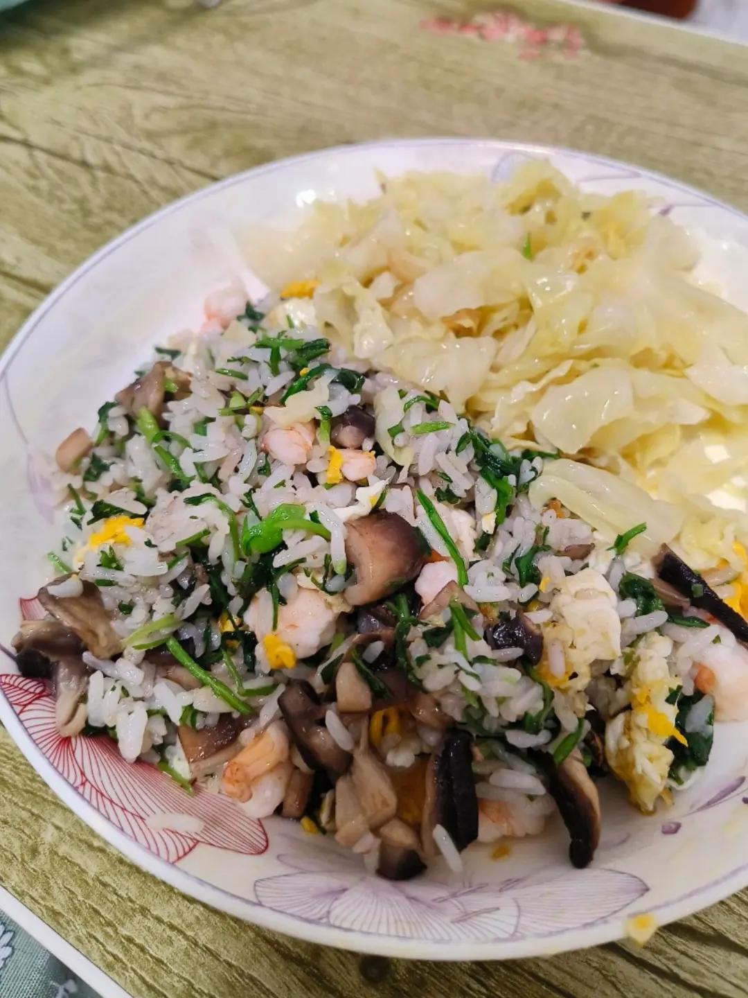 荠菜口蘑虾仁鸡蛋饭+沙县包菜