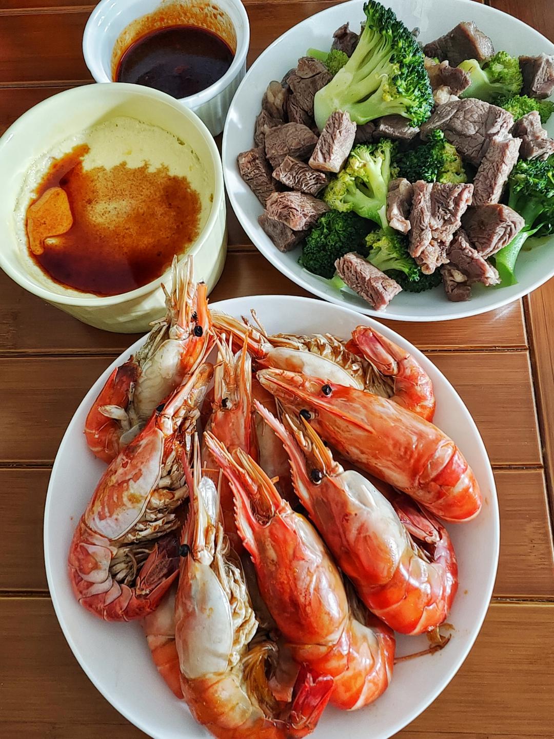 ❥烤罗氏虾丨西蓝花牛排丨蒸鸡蛋羹〉