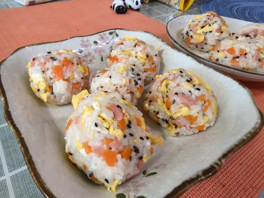 今早做的饭团🍙很成功!老公儿子都说好吃!跟着博主做的,黑芝麻炒虾皮鸡蛋火腿胡萝卜🥕山药沙拉酱,自己调的料汁~