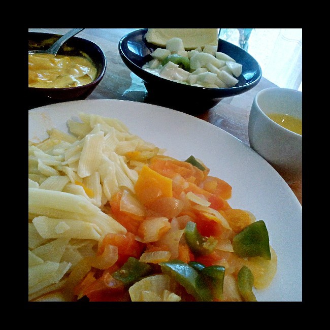 蔬菜意面 橙汁 南瓜豆腐粥。甜品: 香梨优格 奶酪
