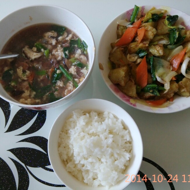 米饭,猪爪黄豆通草汤(菠菜,鸡蛋,胡萝卜),素炒茄子块。看来我每天可以少吃点了...