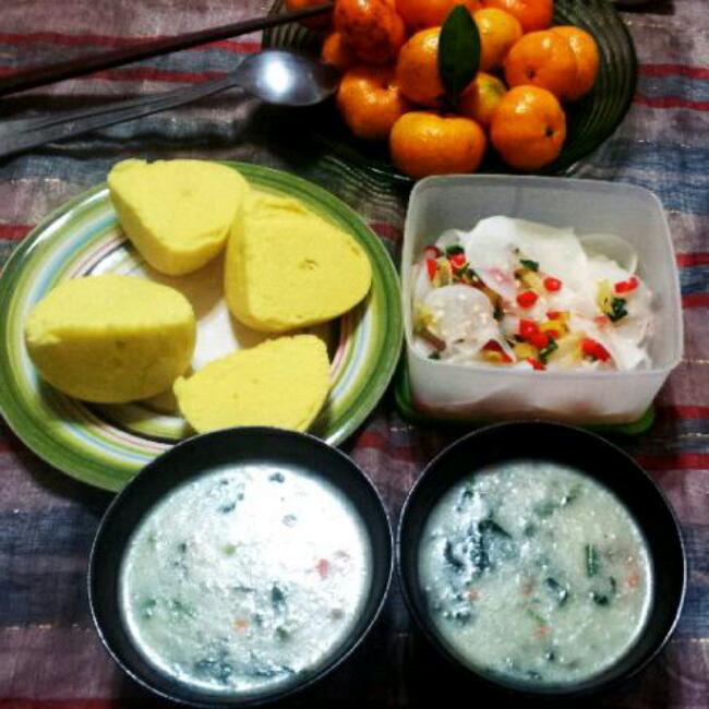 菠菜牛肉胡萝卜粥+玉米窝窝头+清脆爽口泡菜