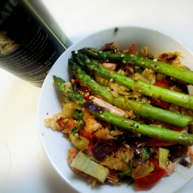 用了剩饭 加了好多蔬菜 用了三文鱼~味道不错~我会说做海鲜只为了能喝白葡萄酒嘛^ω^#午餐...