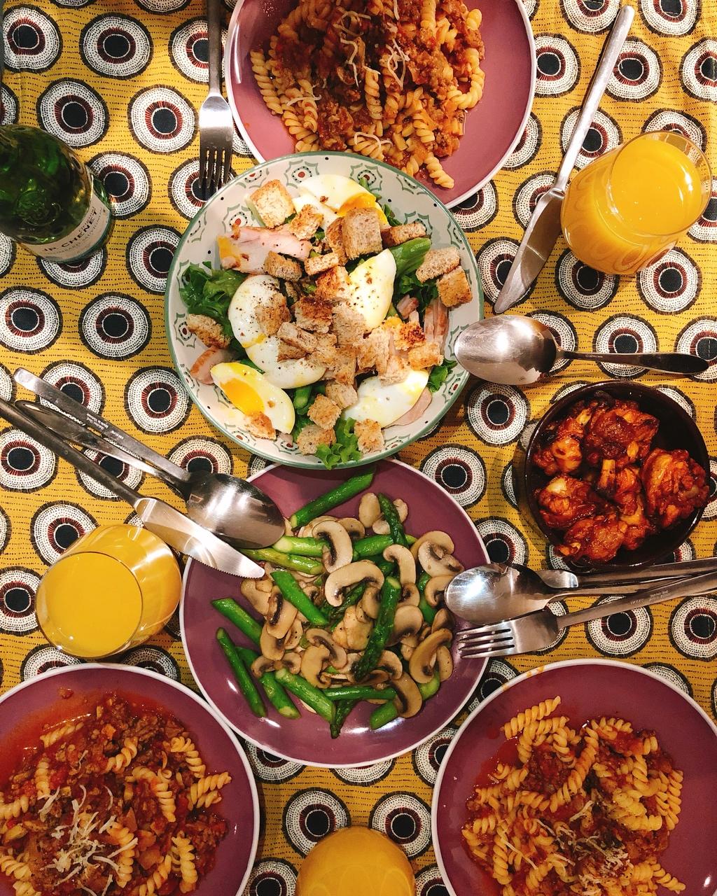 第一次做了三人份的晚餐,凯撒色拉,芦笋炒蘑菇,烤鸡翅,肉酱意面,饭后来个Méert的甜点简直美滋滋啊! #晚餐•2018...