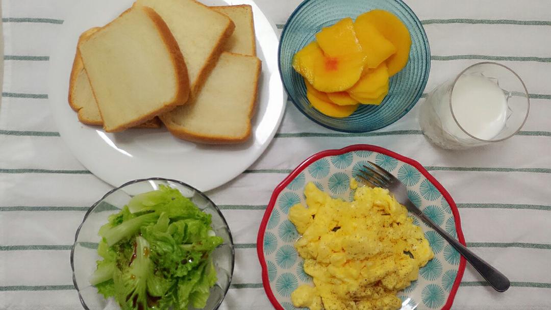 早 牛奶滑蛋+葡萄醋生菜+黄桃+面包+牛奶