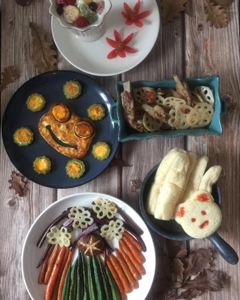 青蛙苦瓜煎蛋,水果沙拉好看;莲藕排骨下饭,黑椒蔬菜点赞。[呲牙][呲牙]