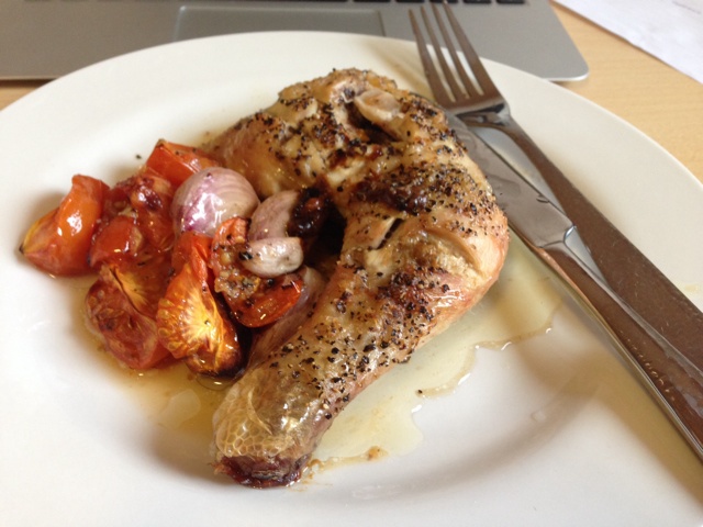 蒜香味,入口即溶的小番茄,这么一个大鸡腿配上昨天剩的土豆汤 真真觉得把一个上午啃一本书损伤的脑细胞补回来了