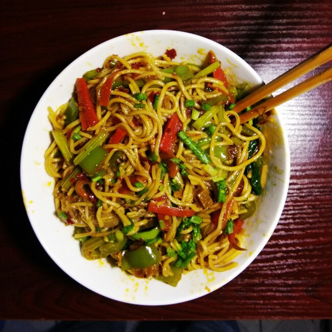 没有放鸡蛋。加了绿豆芽,芹菜,胡萝卜和自制油辣椒。很好吃啊
