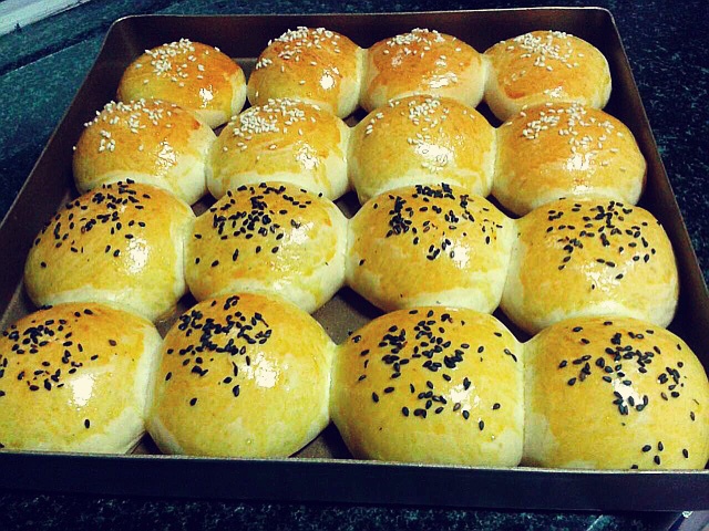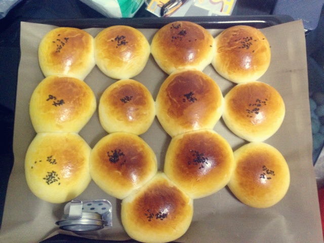 包了黑芝麻的红豆馅、白芝麻的肉松馅,柔软好吃!这配方用我的烤盘明显少了,下次弄多点让它们排得挤一点,出来效果会更好看的。...
