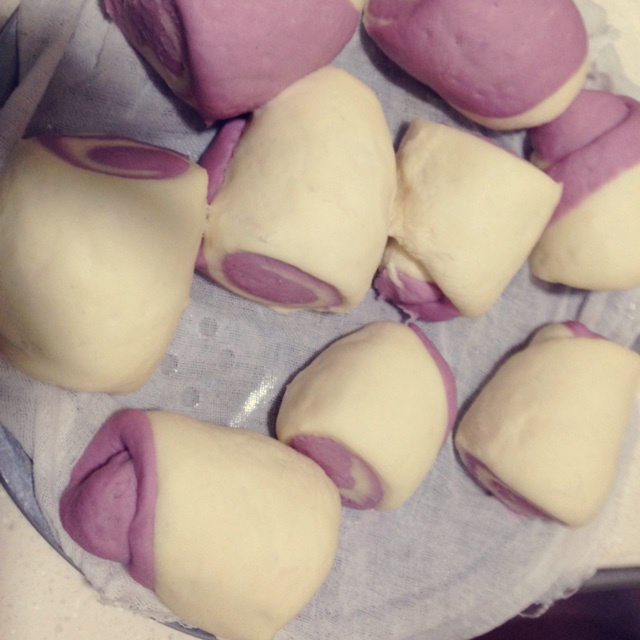 我的紫薯馒头不够紫 而且紫薯面团太多了包不进去 只好卷起来了