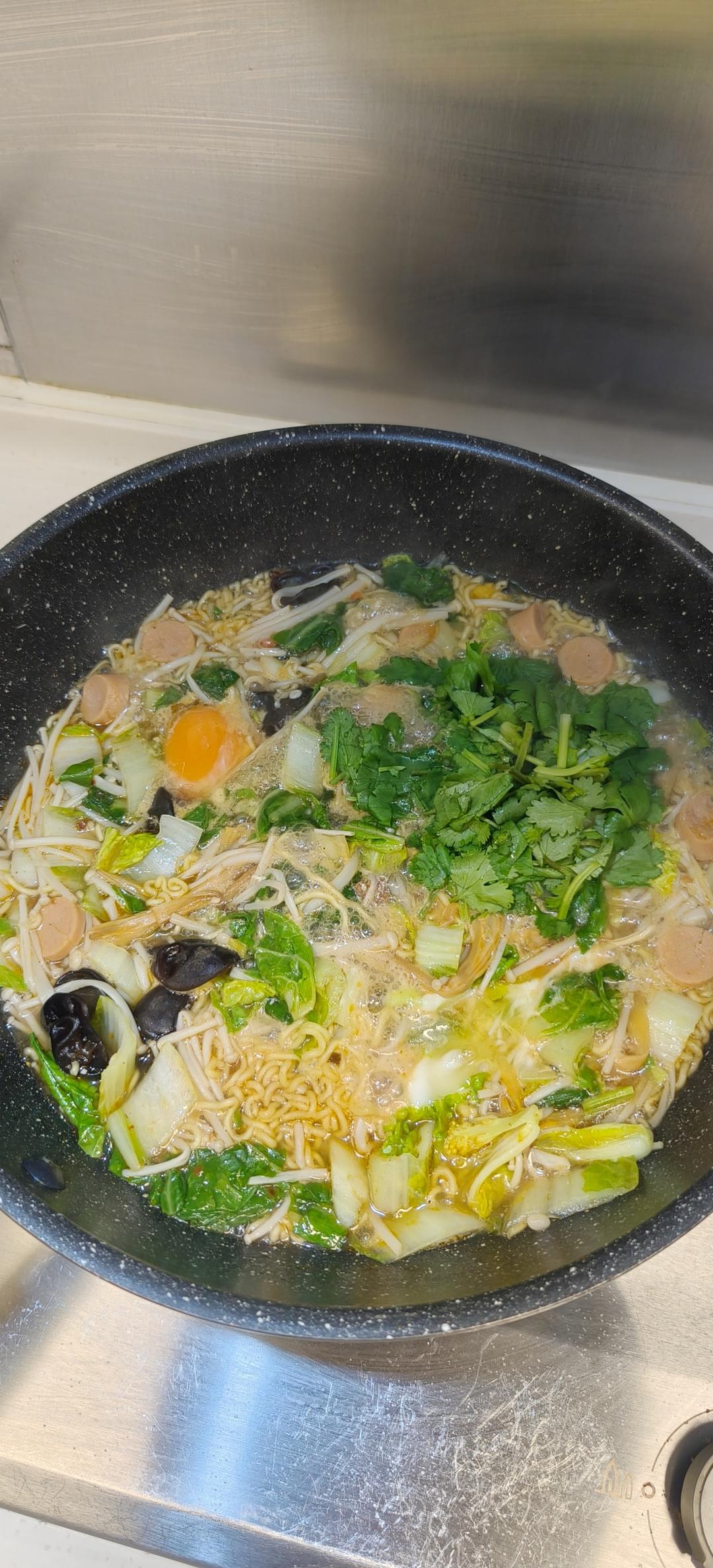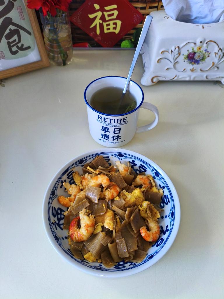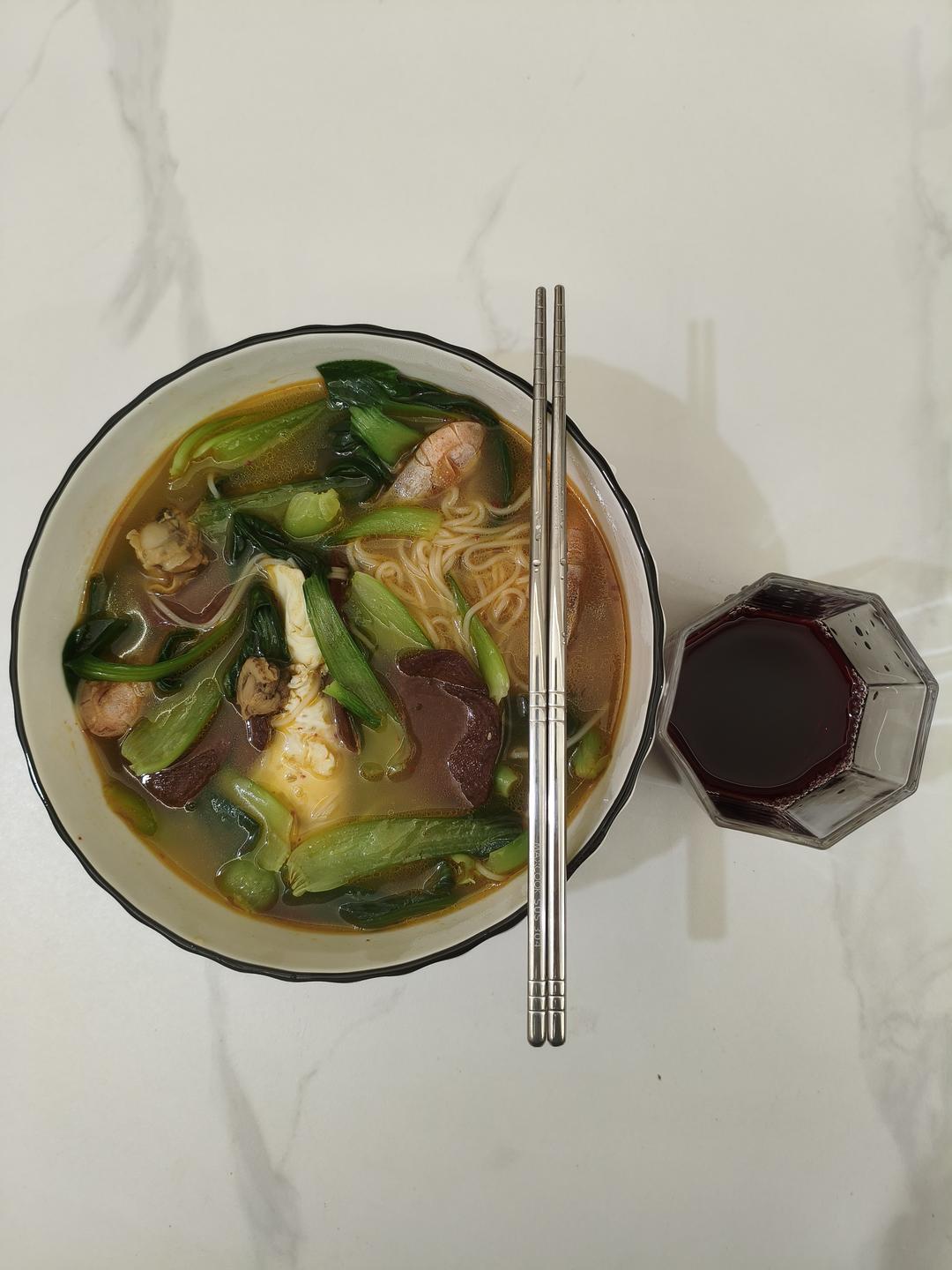 虾扇贝茶干煎蛋青菜面~
