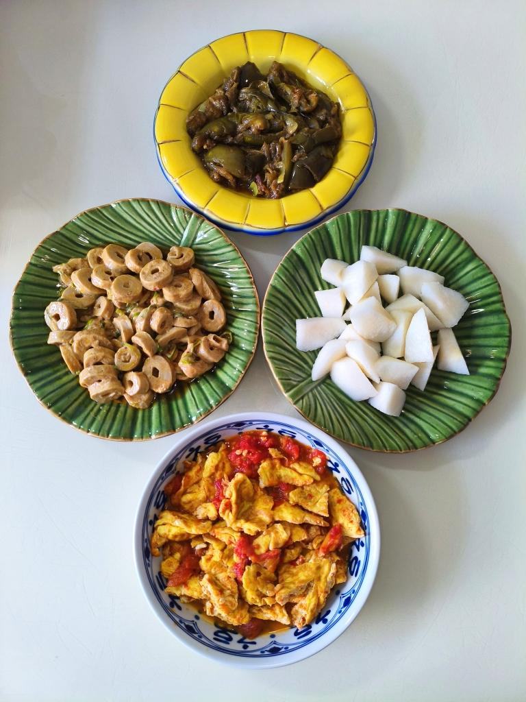 做一次吃两顿,今日晚餐:茼蒿煎饼,醋溜绿豆芽,茄汁虾仁西葫芦,凉拌青椒。