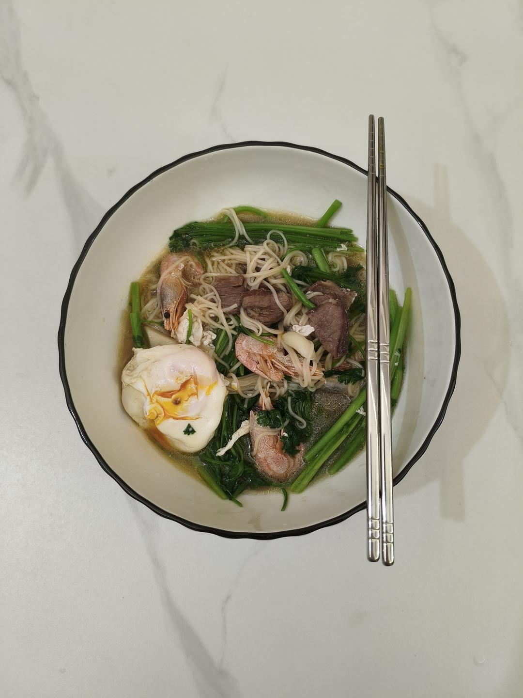 虾、牛肉、鸡蛋、芹菜面~