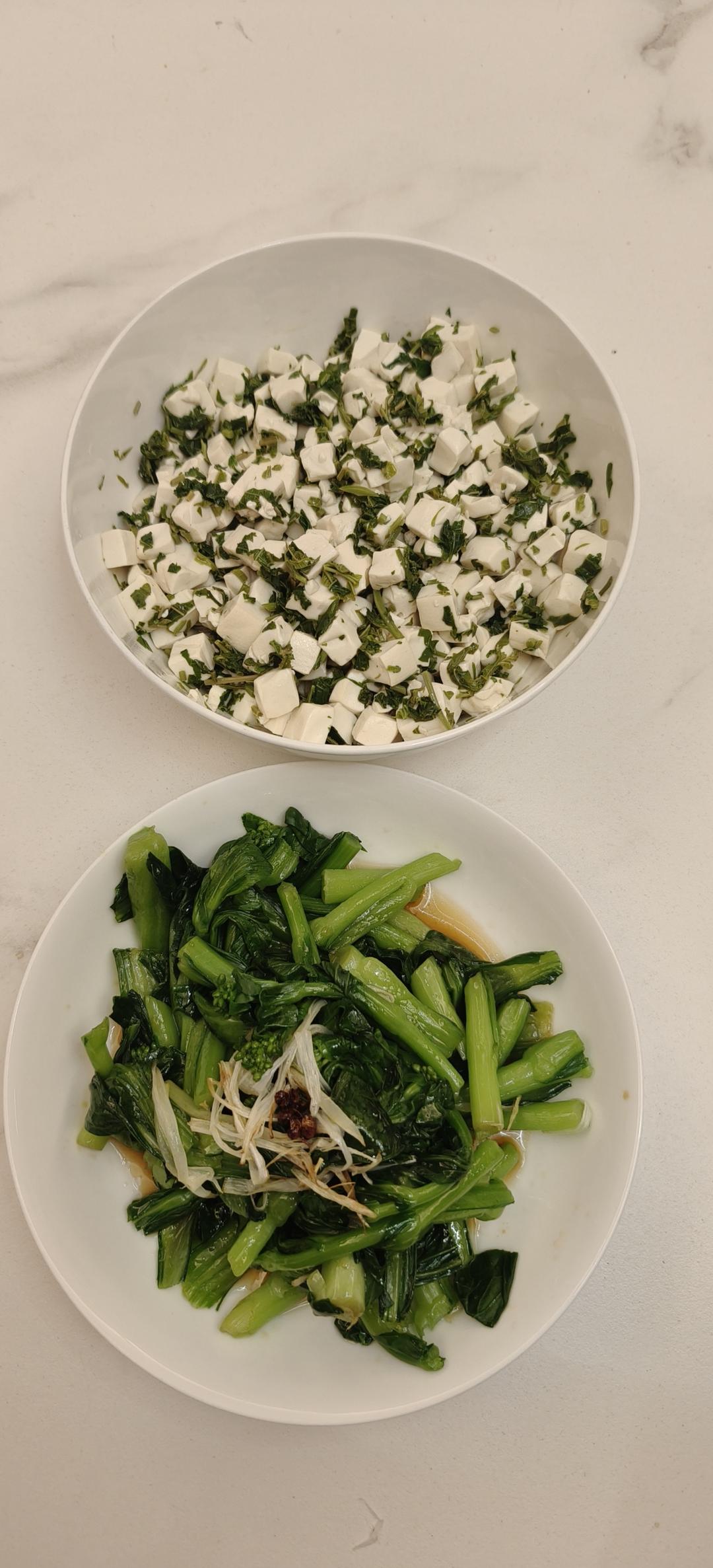 拌香椿豆腐,白灼葱油菜心,鲜嫩无比