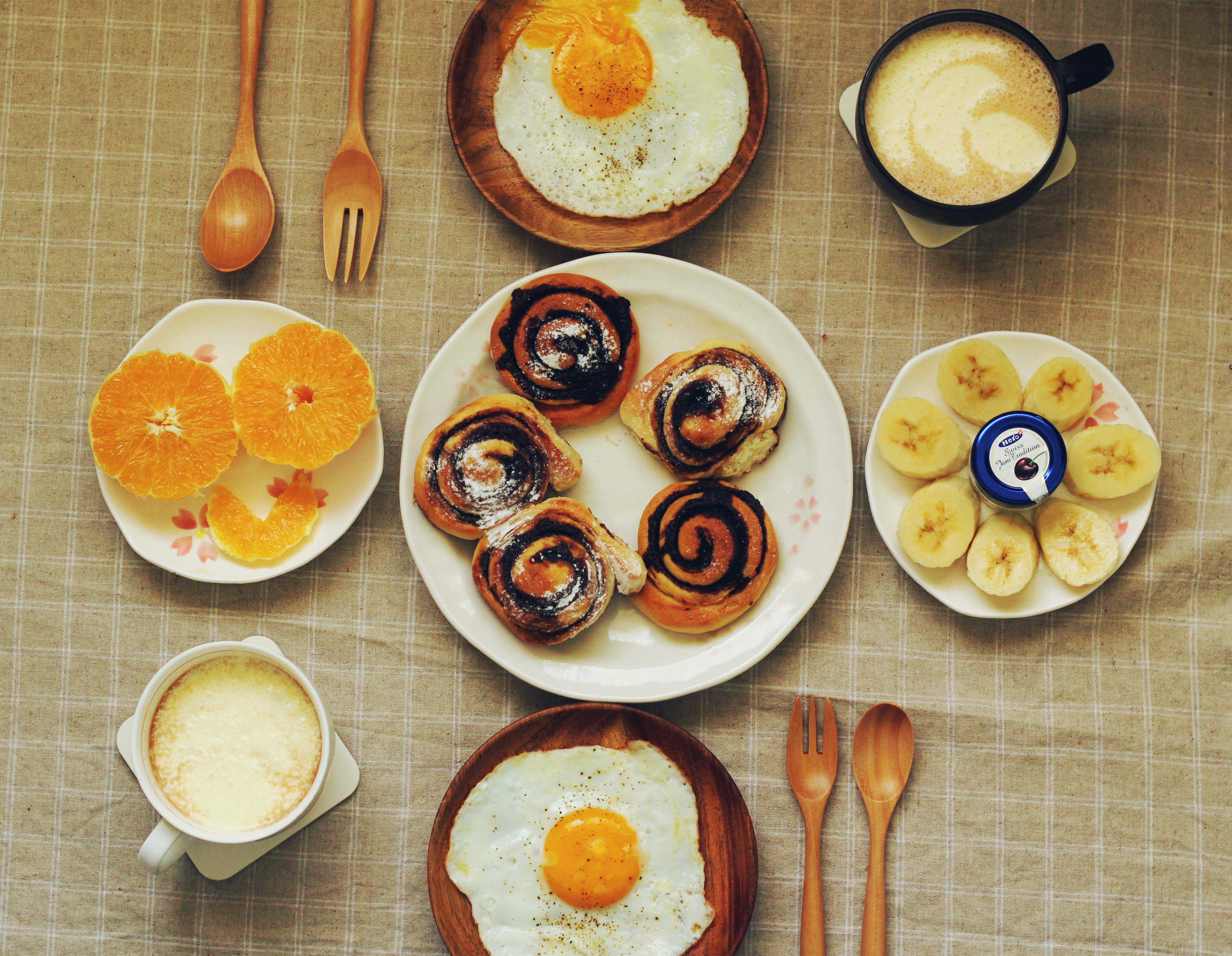 香煎芋头糕,煎蛋,紫薯,杂粮米浆。某种叫不出名字的柑橘。