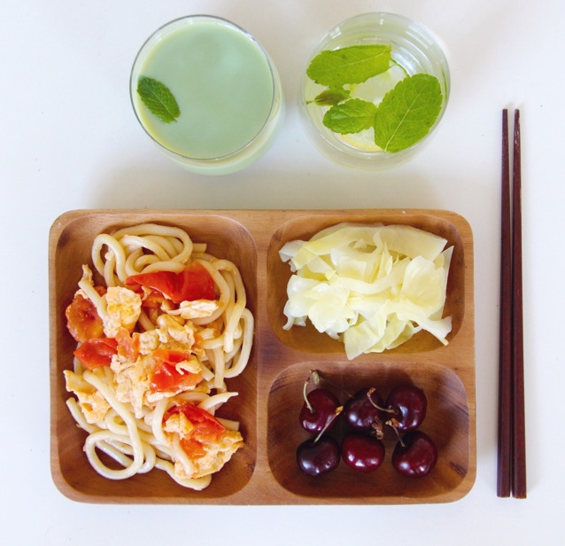 番茄鸡蛋乌冬面+水煮卷心菜+樱桃+抹茶布丁+detox water