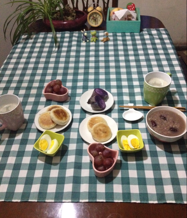 这是昨儿的早餐,忘发了,补发一下。萝卜丝烧饼,紫薯,水煮蛋,红提,杂粮红枣粥,百合绿豆糊。话说做了好多种的烧饼,女儿独对...