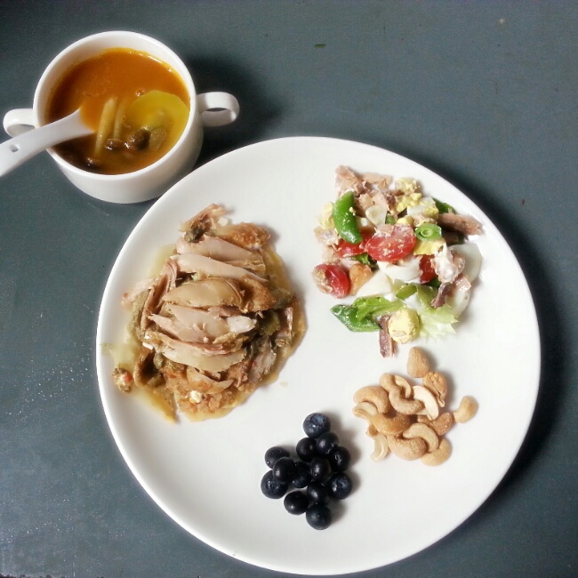 今日早餐:墨西哥薄饼塔+金枪鱼沙拉+腰果+蓝莓+南瓜汤…