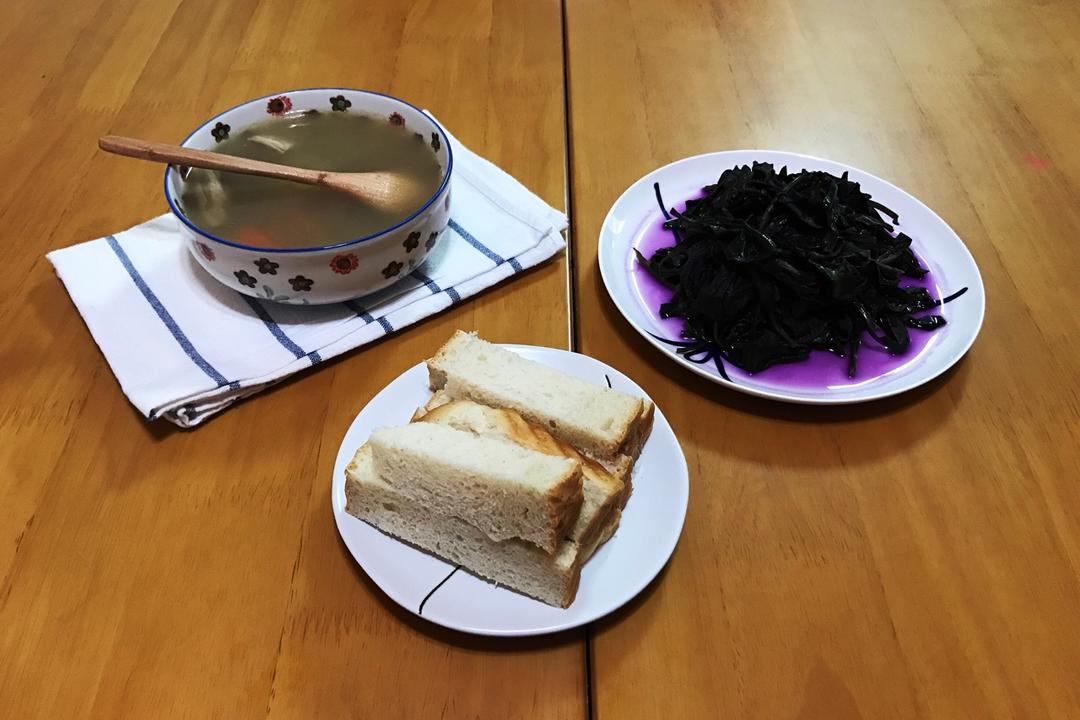晚餐,羊肉胡萝卜汤,中午剩的清炒紫背天葵,主食是全麦面包~~