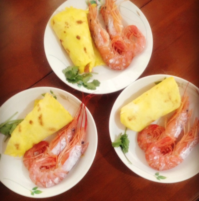 以前做的了,没有放胡椒粉味道也棒棒哒,里面放了火腿卷起来,配上红虾,点个赞~