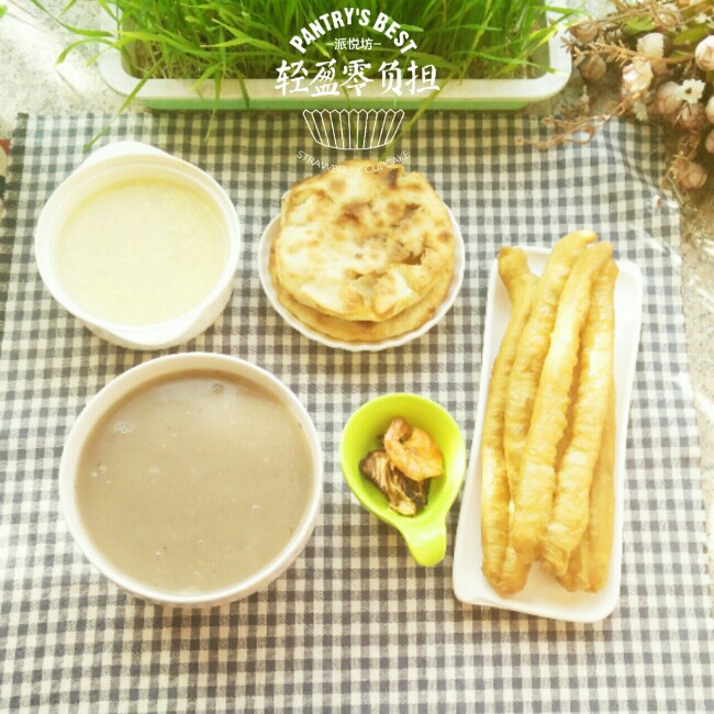 芽芽2-10早餐:猪肉火烧+小米粥,我喝糁吃油条。。
