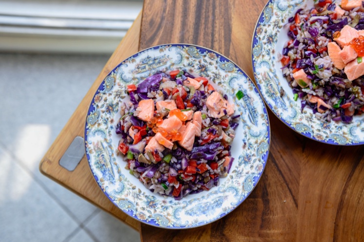 紫甘蓝红椒和葱已经是颜色无比丰富了,再加上粉嫩的三文鱼和亮橙色的鱼籽,味道和颜色双重多姿...