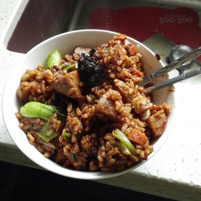 酱油失手多倒了点,饭粒有点黏糊糊不够颗粒分明,自行加了火腿肠粒和贡丸粒,抹了点老干妈,赞!下次应该能做的更好。#午餐•2...