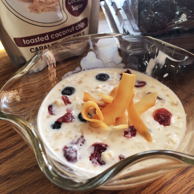 Milk oatmeal, with blueberry, blackberry and coconut chips. ...