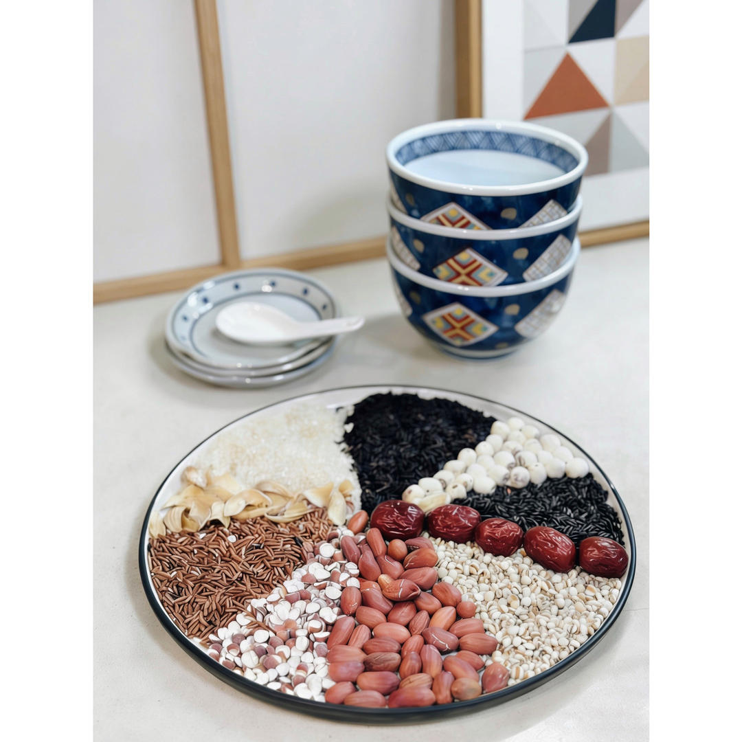 准备明天的腊八粥原料:红米、紫米、黑米、白米、芡实、莲子、薏米、花生、...