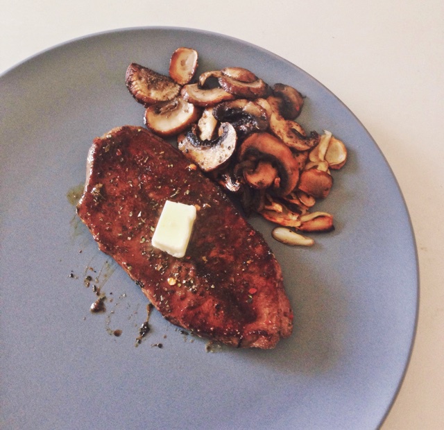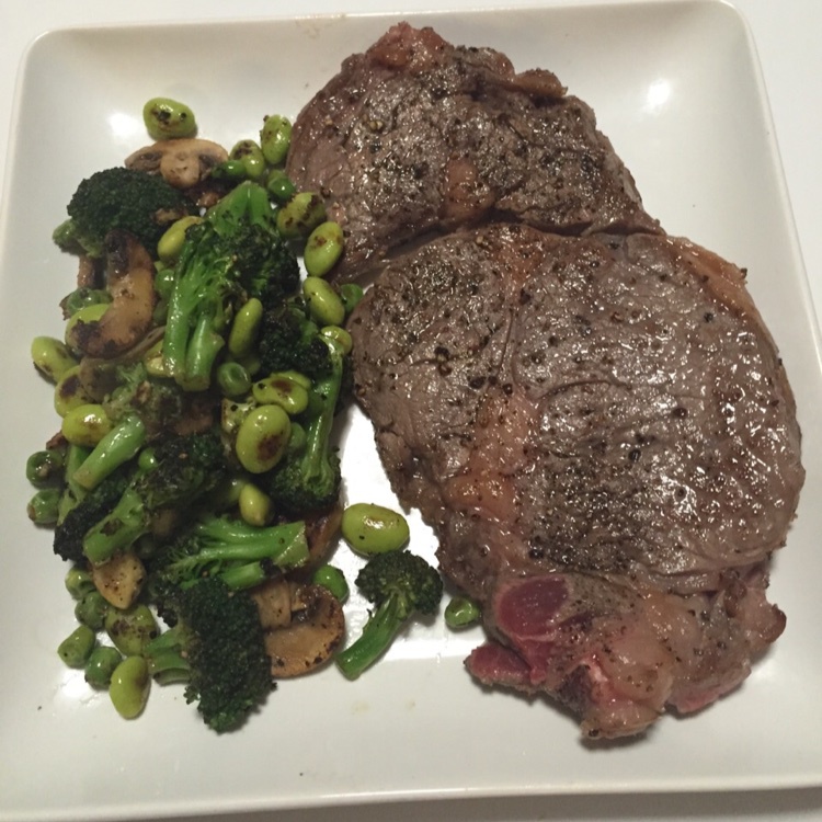 喜欢吃比较生一点的两面加起来大概是煎了2分钟不到。脂肪部分要着重煎一下不太好熟。蔬菜直接用煎牛排剩下的油煎,放了盐和胡椒...