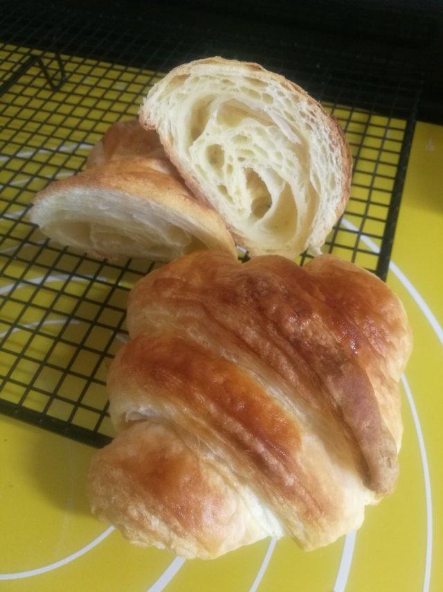 第一次可颂🥐 揉出来的面比较湿,没法整形,黄油没有彻底解冻变软,导致在面里一块一块,分层不好。整形就糊弄了一下。发酵和口...