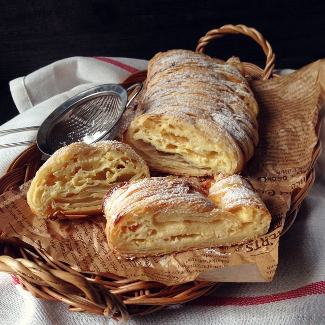 还是飞雪无霜的千层酥皮配方,一份刚好能做这个奶酪麻花辫子。唯一的忧伤是烤箱(长帝25b)太小了所以一条辫...