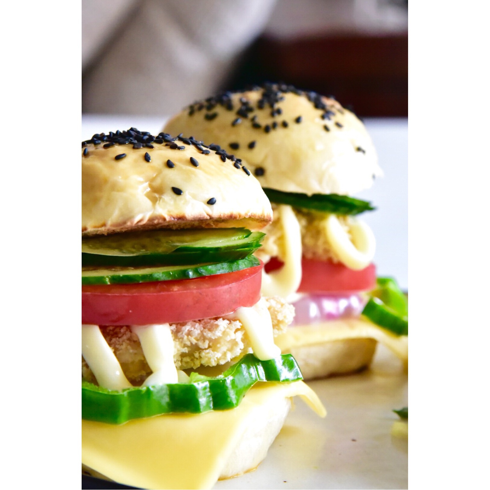 烤了鸡排,烘热了汉堡胚,切了点蔬菜,还铺了片芝士……才想起来,我并没有那么大的嘴,下巴都要咬脱臼了