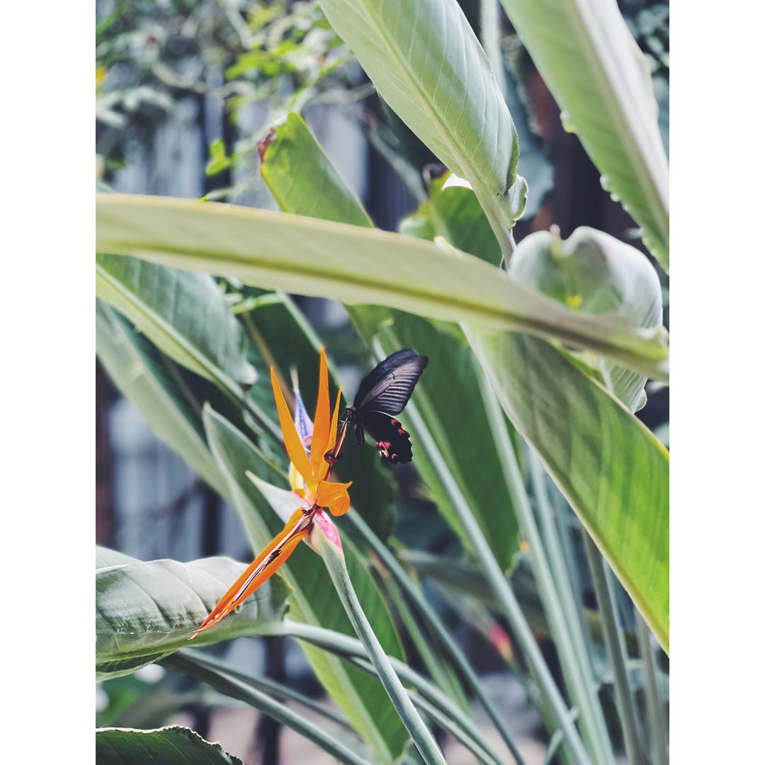 鹤望兰开花了,8枝齐发。蝴蝶也知秋已近,立于枝头觅残红。