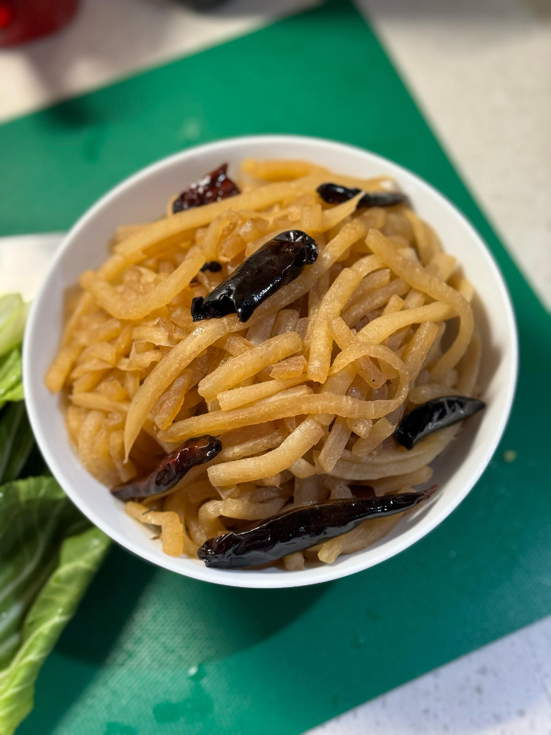 炒蘿蔔絲。蘿蔔焯水、乾辣椒、花椒炒香下蘿蔔炒,炒透明加生抽、鹽。