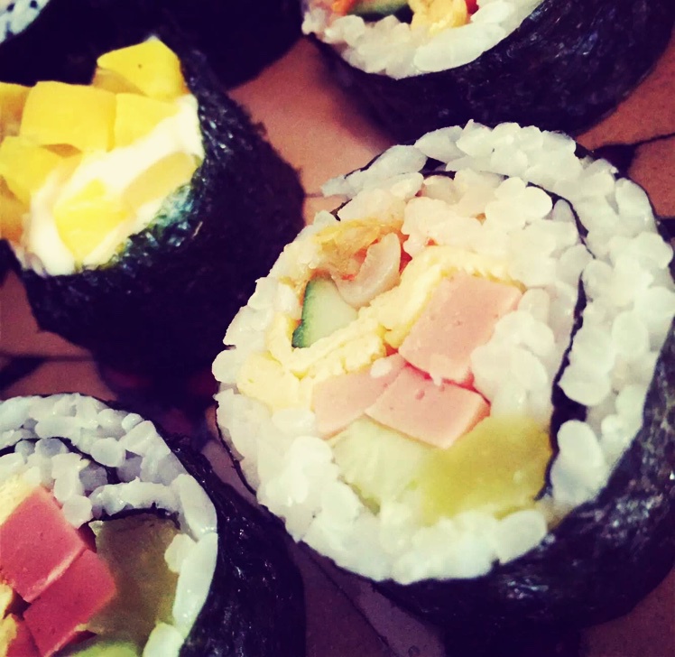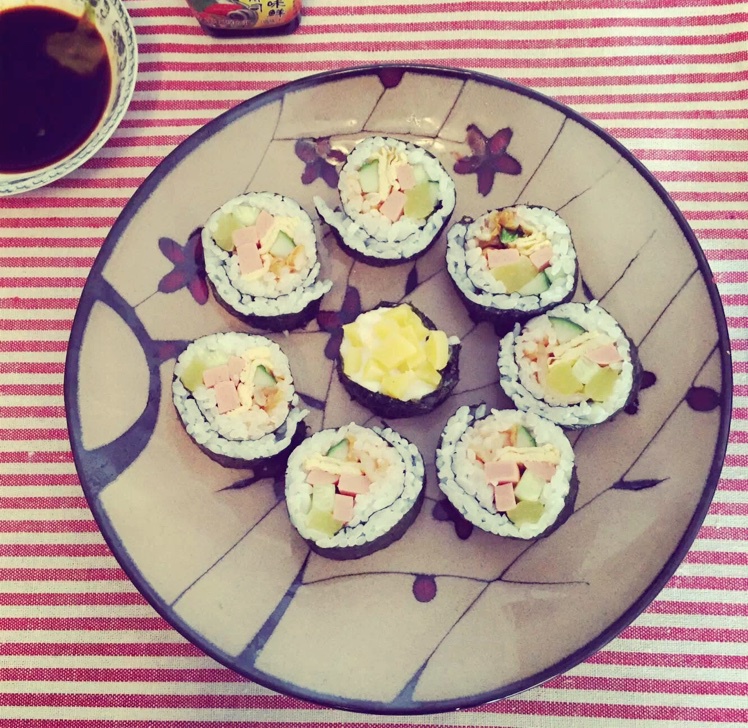用料:大根 黄瓜 火腿 鸡蛋饼 辣白菜 肉松 鱼子酱 沙拉酱..味道自己搭配!