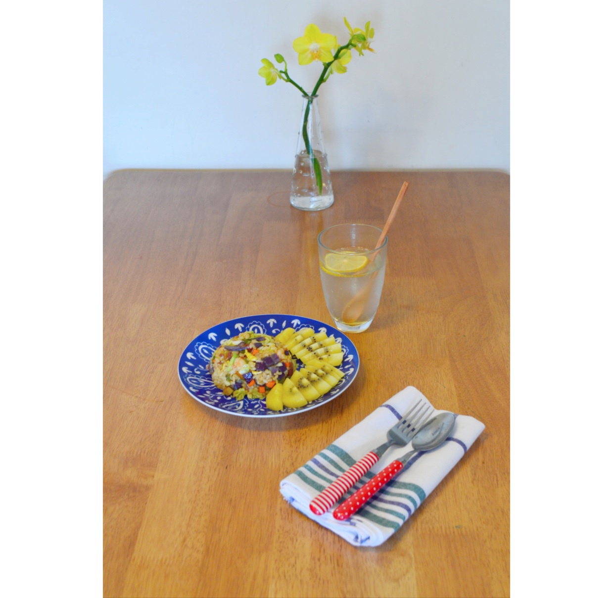 早午餐:什锦炒饭+奇异果+柠檬蜂蜜冻饮